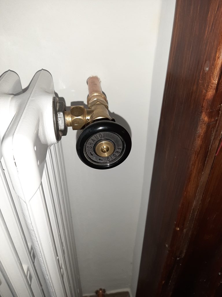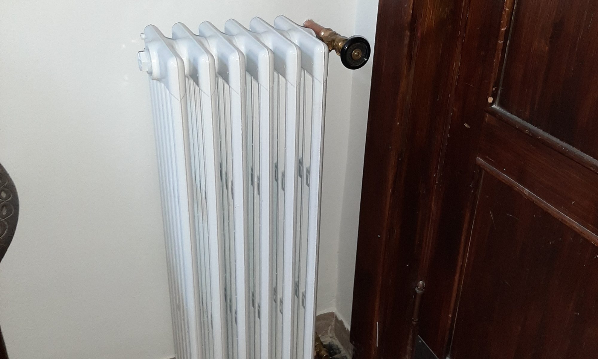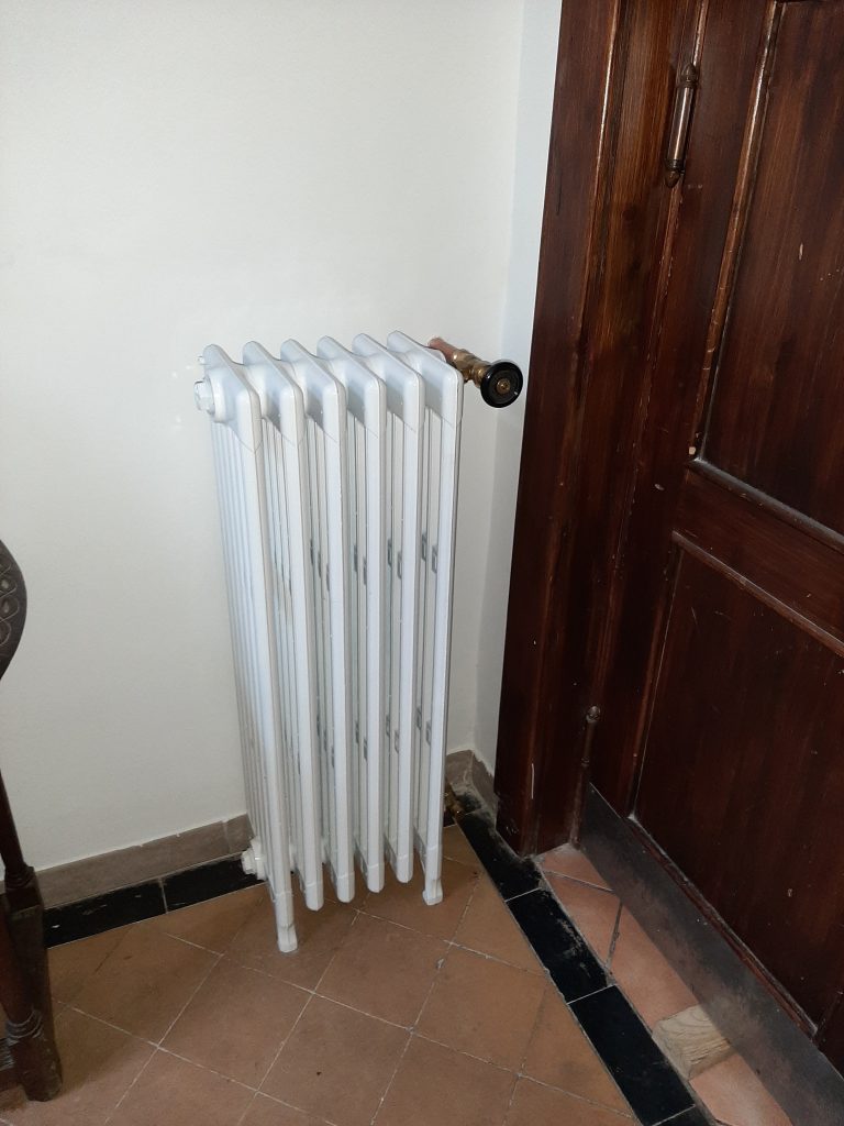 Der Austausch von modernen und angerosteten Plattenheizkörpern gegen Originale hat begonnen. Im Flur wurde nun die erste Heizung angeschlossen. Zuvor wurde der Heizkörper gereinigt und pulverbeschichtet.
