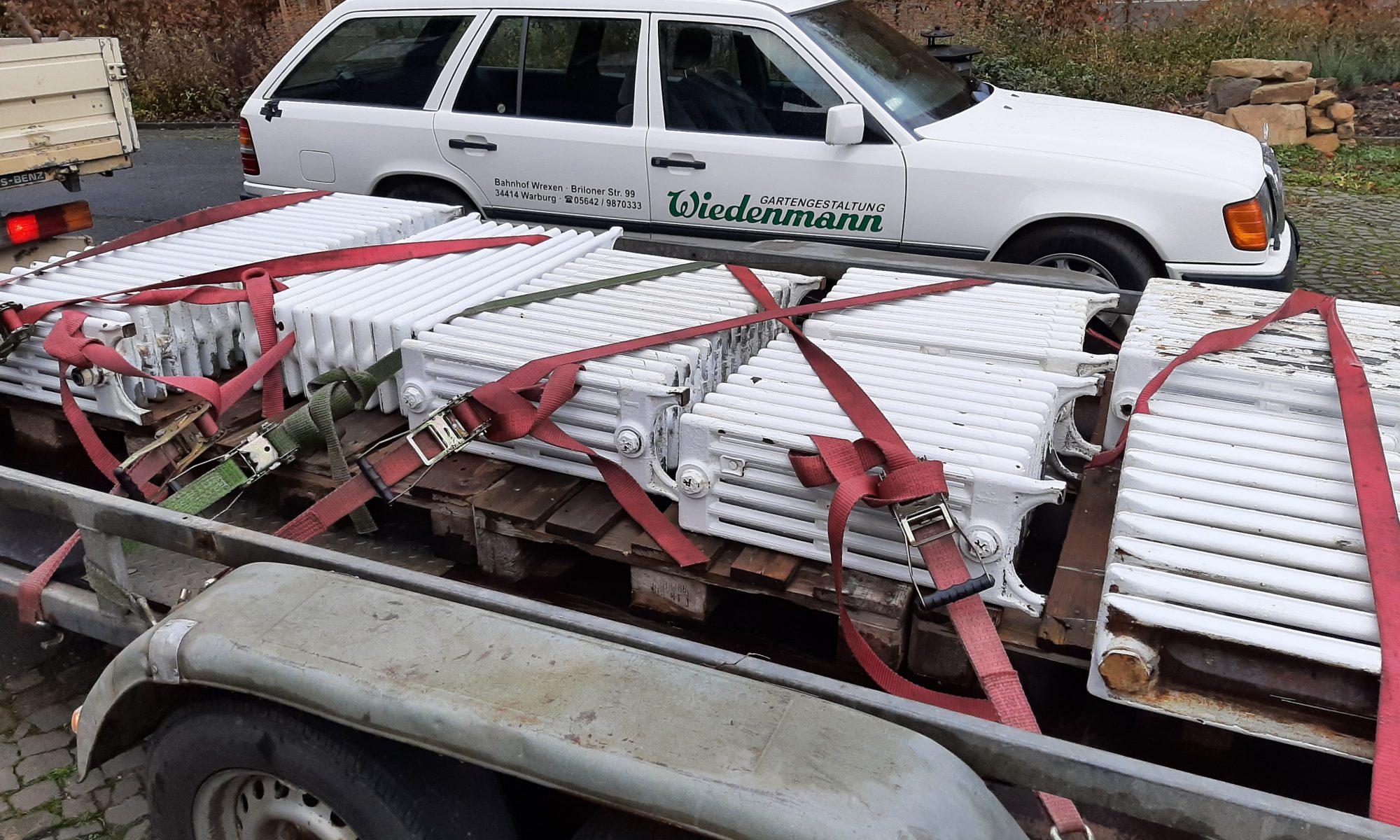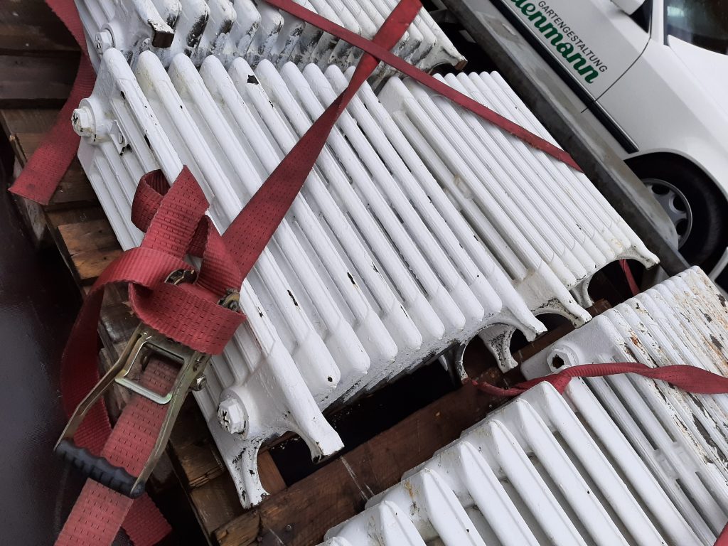 Gerade abgeholt: Eine ganze Ladung alter Heizkörper aus dem Raum Berlin. Nächstes Jahr werden sie gereinigt, entrostet sowie pulverbeschichtet. Wir sind sehr gespannt auf den Einbau!
